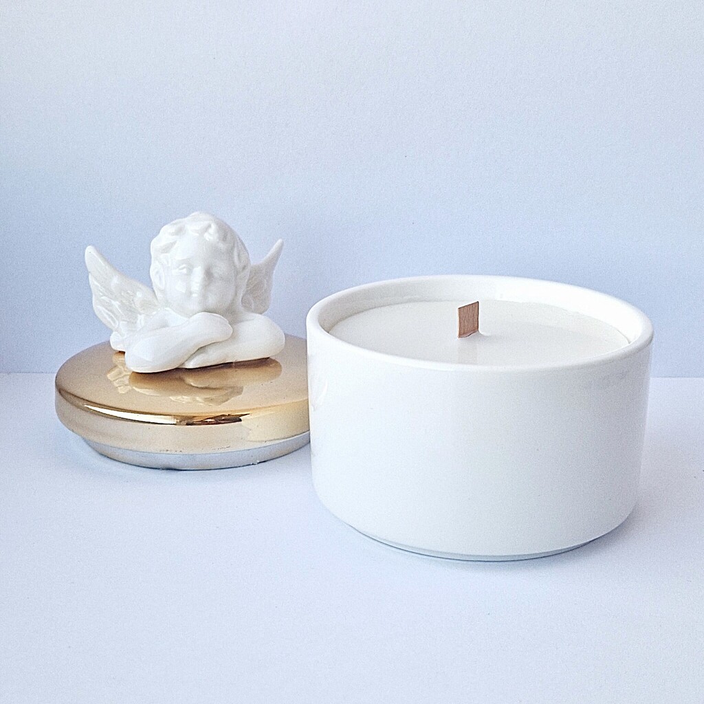 Kvepianti žvakė „Angelas” – tarsi šviesos ir ramybės simbolis. Baltos spalvos keraminiame indelyje su auksiniu dangteliu, kurį puošia subtilus angelas, slypi švelnus aromatas, pripildantis namus jaukumo ir šviesos. Kiekviena detalė sukurta su meile – nuo minimalistinio dizaino iki natūralios spalvų dermės, kuri suteikia interjerui elegancijos ir šventiškumo.