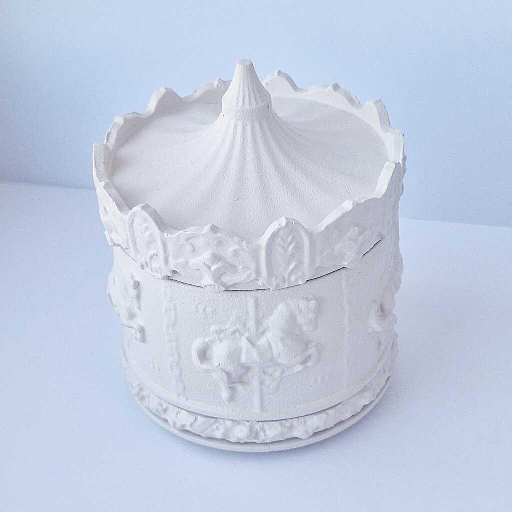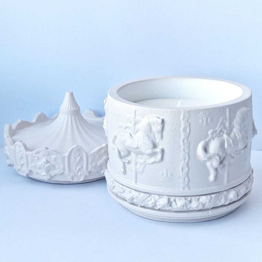 Ši kvepianti žvakė „Karuselė”– tarsi mažas meno kūrinys, sukurtas pripildyti namus šilumos, jaukumo ir subtilios elegancijos. Rankų darbo gipso indelis, primenantis senovinę karuselę, žavi savo detaliu reljefu ir švelnia, matinės kreminės spalvos tekstūra. Kiekviena detalė kruopščiai išformuota, todėl žvakė tampa ne tik aromato šaltiniu, bet ir išskirtine interjero puošmena.
