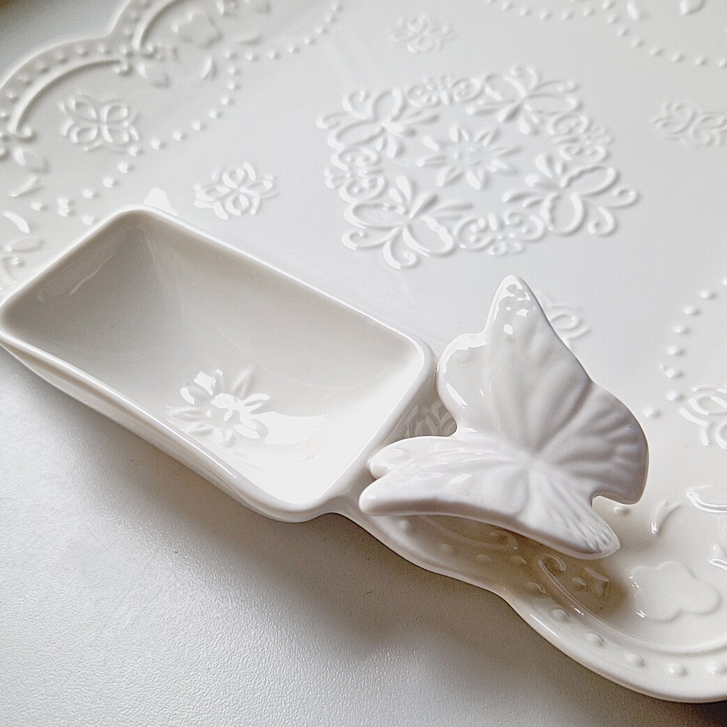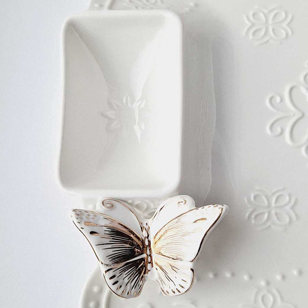 Elegantiškas porcelianinis padėklas su subtiliais ornamentais ir dekoratyviniu drugelio dekoru – tai stilingas pasirinkimas jūsų stalo serviravimui. Padėkle yra patogus mažas skyrelis padažui ar smulkiems pabarstukams, todėl jis ne tik estetiškas, bet ir itin funkcionalus. Balta spalva bei reljefiniai raštai suteikia padėklui išskirtinio rafinuotumo, o drugelio akcentas kuria lengvumo ir šventiškumo pojūtį. Puikiai tinka tiek kasdieniam naudojimui, tiek ypatingoms progoms.